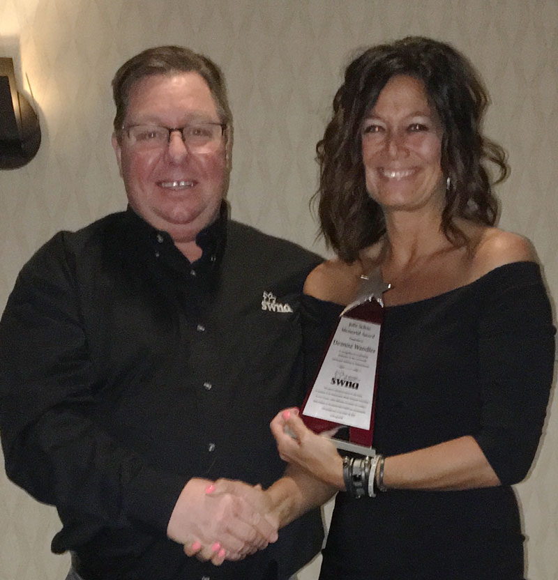 Deanna Wandler was awarded the Julie Schau Memorial award at the SWNA awards banquet held April 6th in Regina.  Deanna is the sales manager and partner in the Lloydminster Meridian Source,  an AWNA member paper as well as SWNA, serving the border city and surrounding areas in both our provinces.